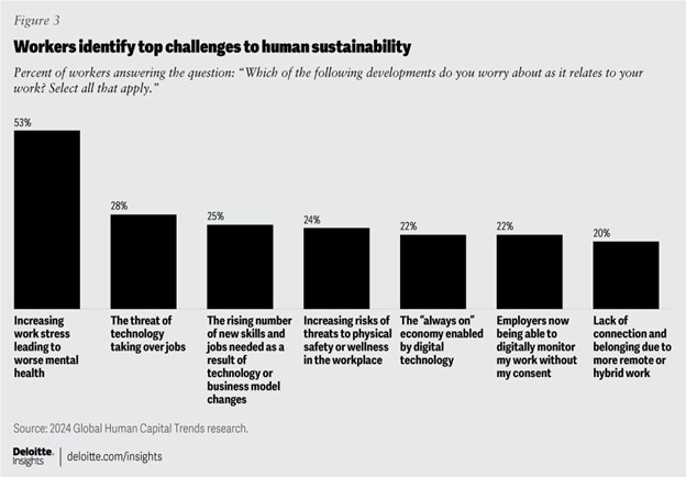 The Deloitte 2024 Global Human Capital Trends report surveyed 14,000 respondents from 95 countries. The report discusses that in a post-pandemic world the reality of work is changing as traditional paradigms are challenged by the introduction of new and disruptive technologies, like generative artificial intelligence.