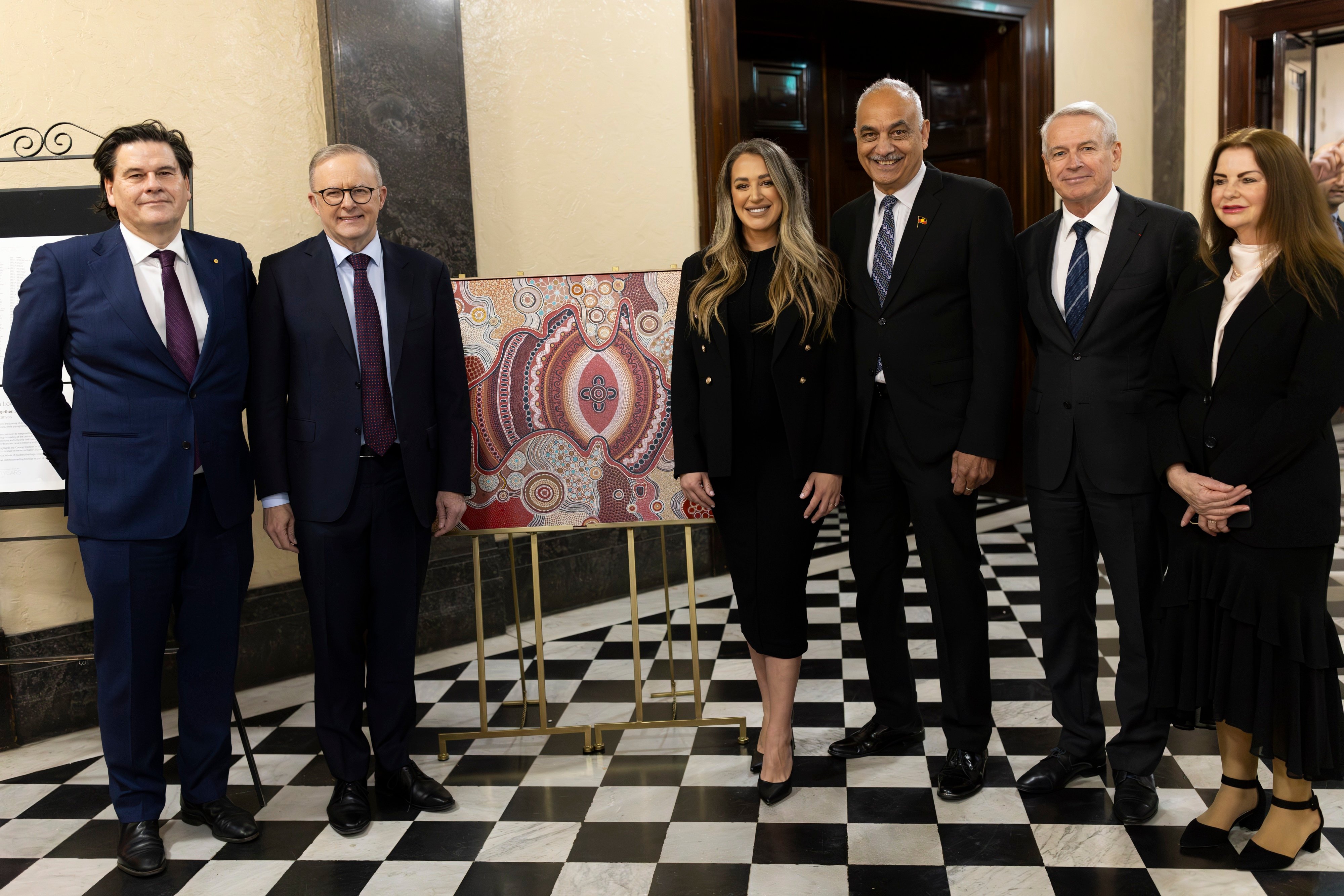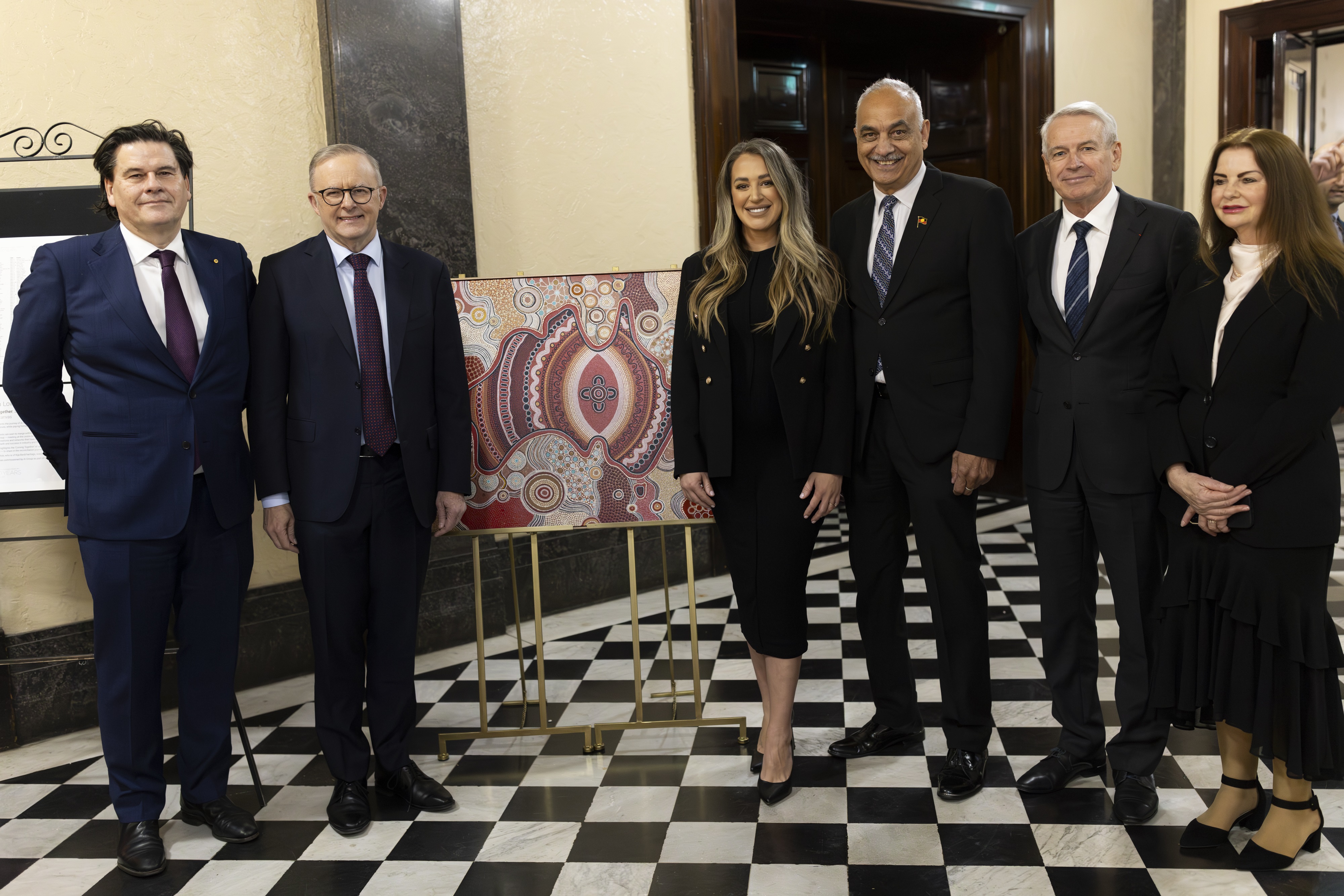 Coming together: L-R Ai Group Chief Executive Innes Willox, Prime Minister of Australia Anthony Albanese, artist Kamilya White, Ralph White, Ai Group National President Chris Jenkins and NSW Indigenous Chamber of Commerce (NSWICC) Chairperson and Executive Officer Deb Barwick.