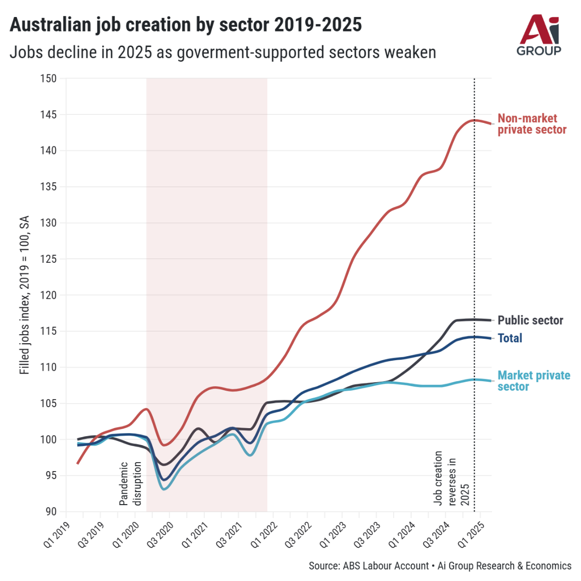 "The fall in jobs in early 2025 reveals the extent that the Australian labour market has become dependent on government-supported employment generation – and the need to get the private sector growing again," said Innes Willox, Chief Executive of the Australian Industry Group.