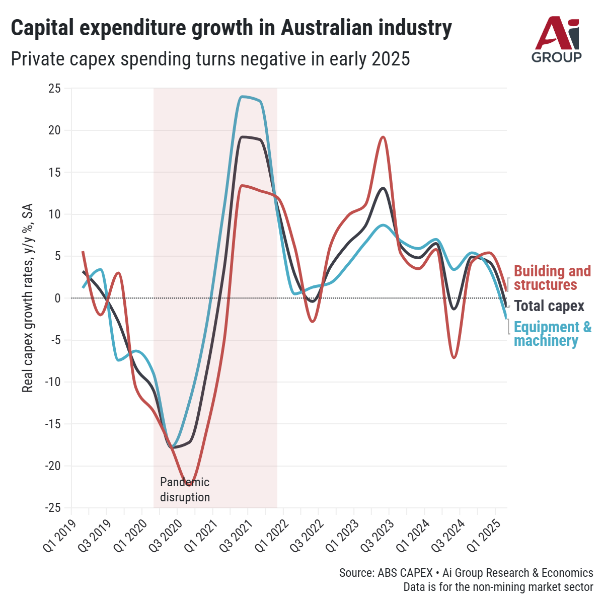 New ABS data shows new private capital expenditure fell by 0.1% in first quarter of 2025 on year-on-year terms. However, the figures for the non-mining market sector point to a much steeper fall of 1.1%.