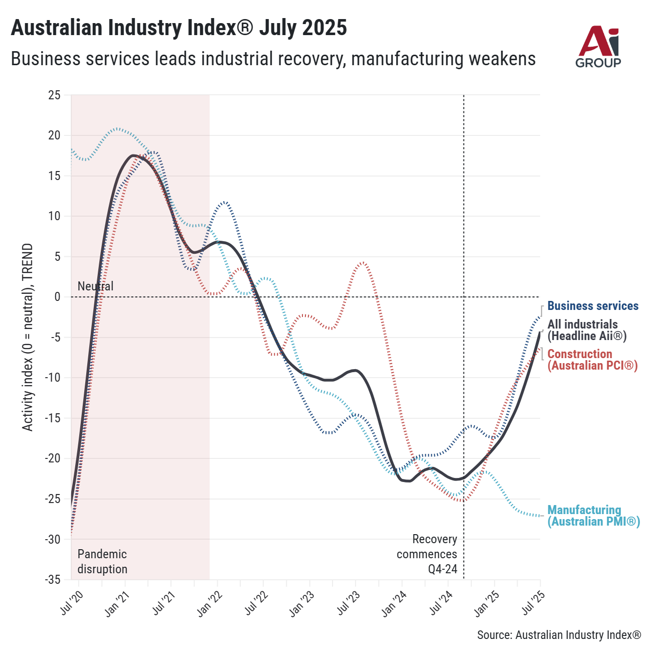 The July Australian Industry Index® – a monthly survey of business activity in industrial sectors – reveals a clear pattern of recovery since late 2024. Activity indicators for the construction and business services sectors have been improving towards neutral this year, however manufacturing activity continues to weaken.