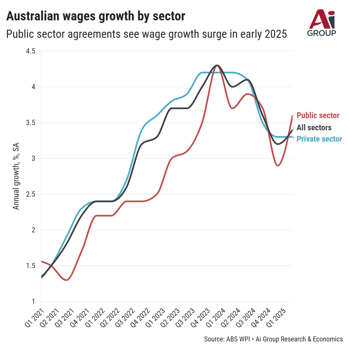 Data from the Australian Bureau of Statistics shows wages growth rose to 3.4% p.a. in the first quarter of 2025. With private sector wages steady, the rise was wholly driven by the public sector which saw wages growth leap from 2.9% to 3.6% p.a. in a single quarter.