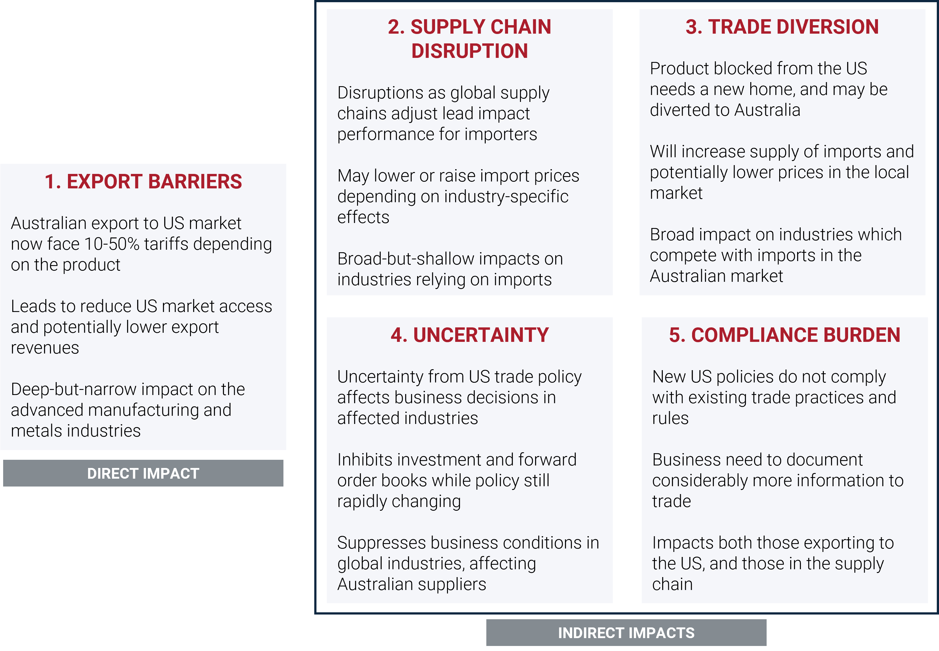 It is too soon to determine the precise effects of new US tariffs on either the global or Australian economies. This is because the final rate of many of these tariffs – particularly the reciprocal rates for major economies like China and the EU – remain to be negotiated. Where these land for different products and countries will determine the ultimate economic impact of the US tariffs. However, it is possible to identify the mechanisms via which they are likely to impact Australia and our trade-exposed industries. Two distinct types of impact are evident (Figure 2).